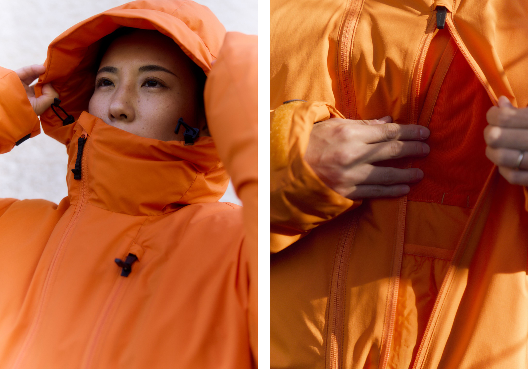 裾やフードは風の侵入を防ぐアジャスター付き。