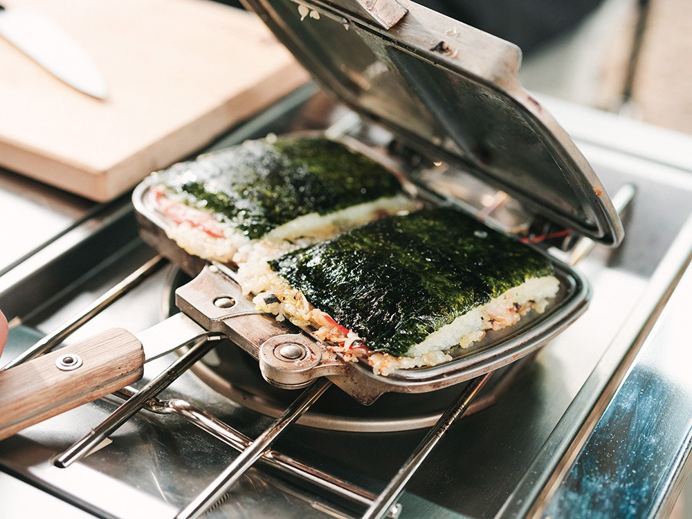 塩コショウの味付けだけでなく、豪快に卵やチーズで挟み込んでしまうのもキャンプならではの楽しみ方のひとつ。