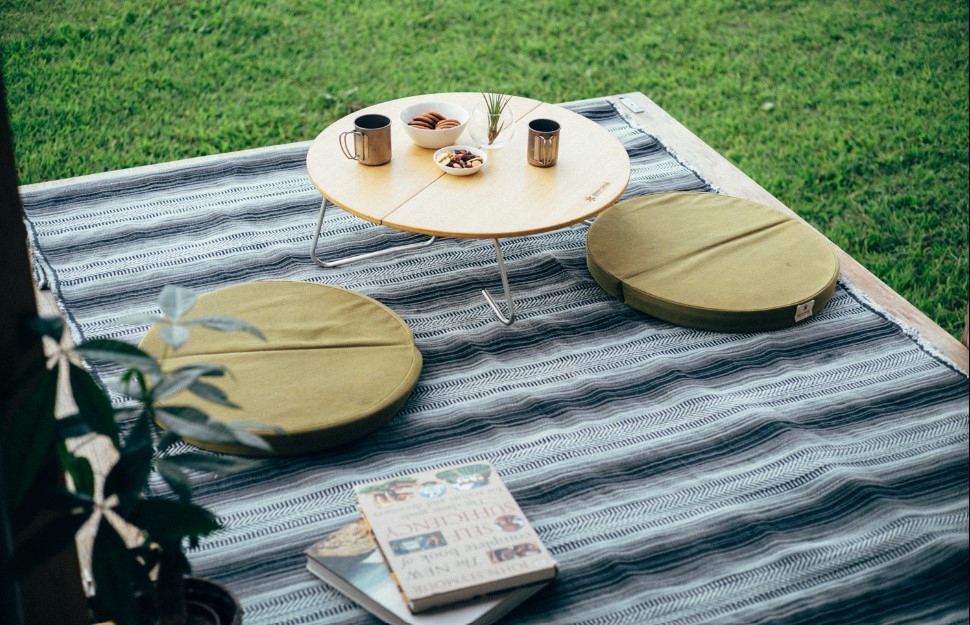 トラディショナルなイメージの「ワンアクションちゃぶ台竹」に、お好みで「グランドパネルチェア」か「ラウンジクッション」をお選びください。