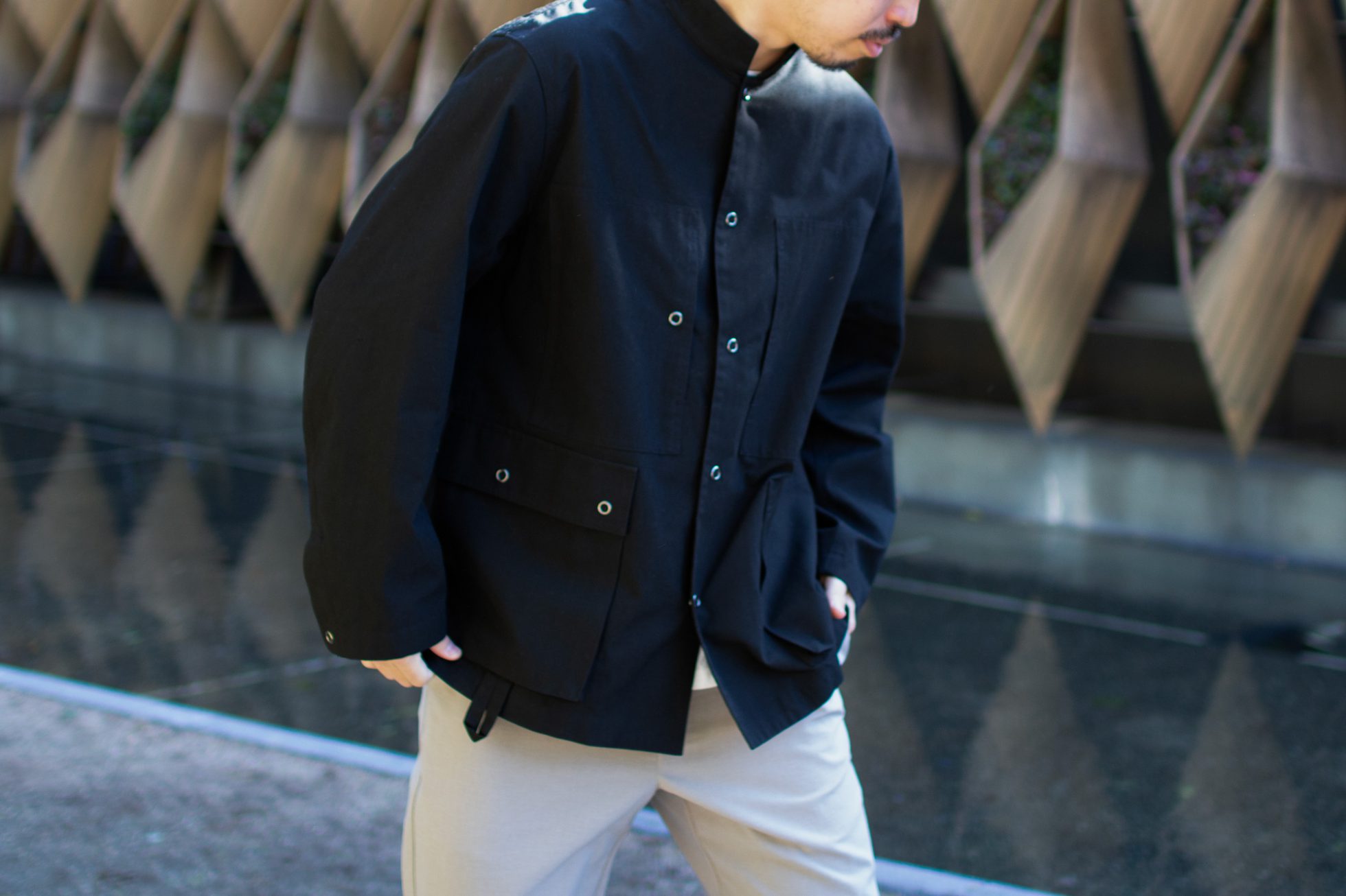 デニムやチノパンツにも合わせやすいスタンドカラージャケットは、デイリーにも活躍します。