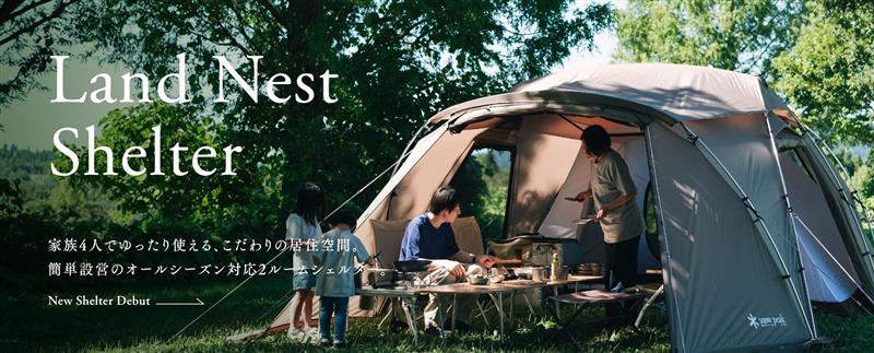 2025年新製品の「ランドネストシェルター」は、オールシーズン対応でありながら、キャンプ初心者でも簡単に設営できるオススメのアイテムです。
